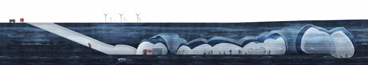 Buildings and base stations have grown exponentially in the last 20 years in the Antarctic. For 2010, about 80000 tourists are expected to visit the South Pole, and an average of 5000 researchers are based in the main land during the summer period. This proposal aims to design a living station for 100 visitors with minimum environmental impact. To achieve this, we aim to avoid “building” by traditional means, which would implicate transporting materials foreign to the continent, which never leave Antarctica again. Instead, the “architecture” is holed out in a super large iceberg (about 2.5 square kilometre area), which would eventually melt in 7 to 10 years time. Icebergs are compacted snow, which only become ice at a depth of 25 metres, and as igloos have demonstrated trough out the centuries, snow is a very efficient insulation. Caterpillar excavators, traditionally used in the Antarctic to move and clear snow, would cut out the spaces inside the iceberg. The geometric logic of the movement of these machines, now used to “design and cut” the spaces, create the curves of the interiors. Two access ramps (one for pedestrians, the other for vehicles) give access to the main hall and canteen, with access to kitchen, medical services, and toilets. From this public area the living station grows into an array of passages, which give access to the sleeping quarters, clustered in groups of eight or nine rooms around a common lounge. A lecture/conference hall allows for cultural activities. Containers would transport food and reusable solar cells and energy equipment, and would be used to store waste and grey water residue, which can be shipped of regularly.